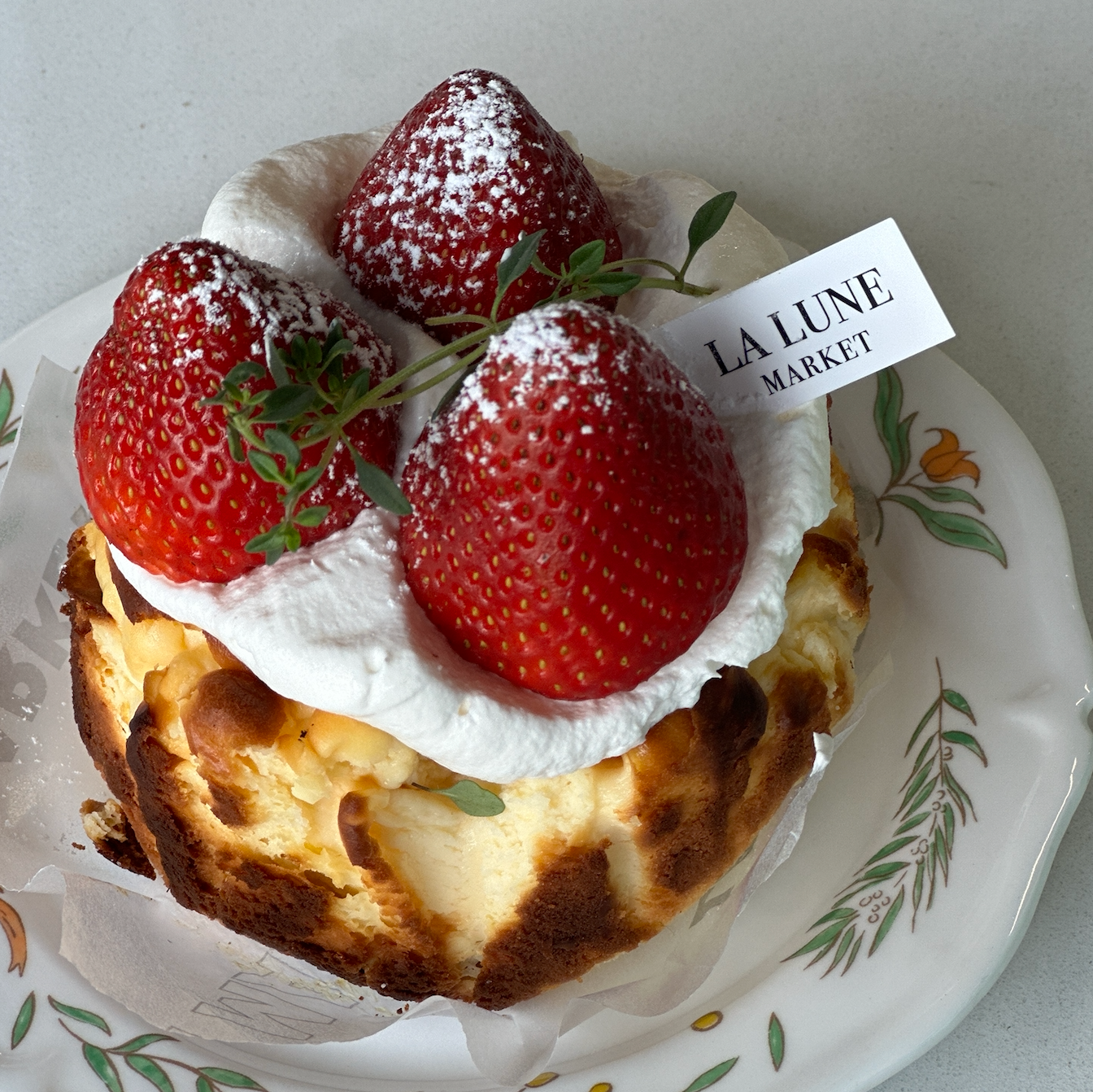 Original basque cheesecake topped with fresh cream and strawberries. 2 sizes available, mini & midi